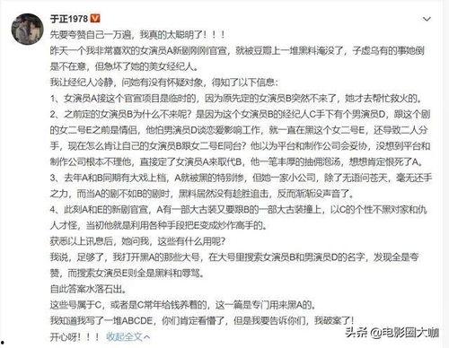 其实,于正的这次爆料,也让我们看到了娱乐圈的现状。在这个光鲜亮丽的背后,隐藏着许多不为人知的秘密。有些明星为了追求名利,不惜牺牲自己的道德底线;有些导演为了追求效果,甚至让演员们冒着生命危险。